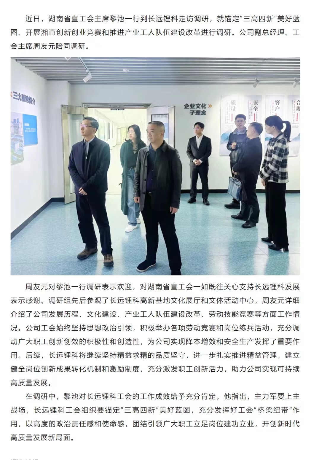 湖南省直工會主席黎池一行到長遠鋰科走訪調研
