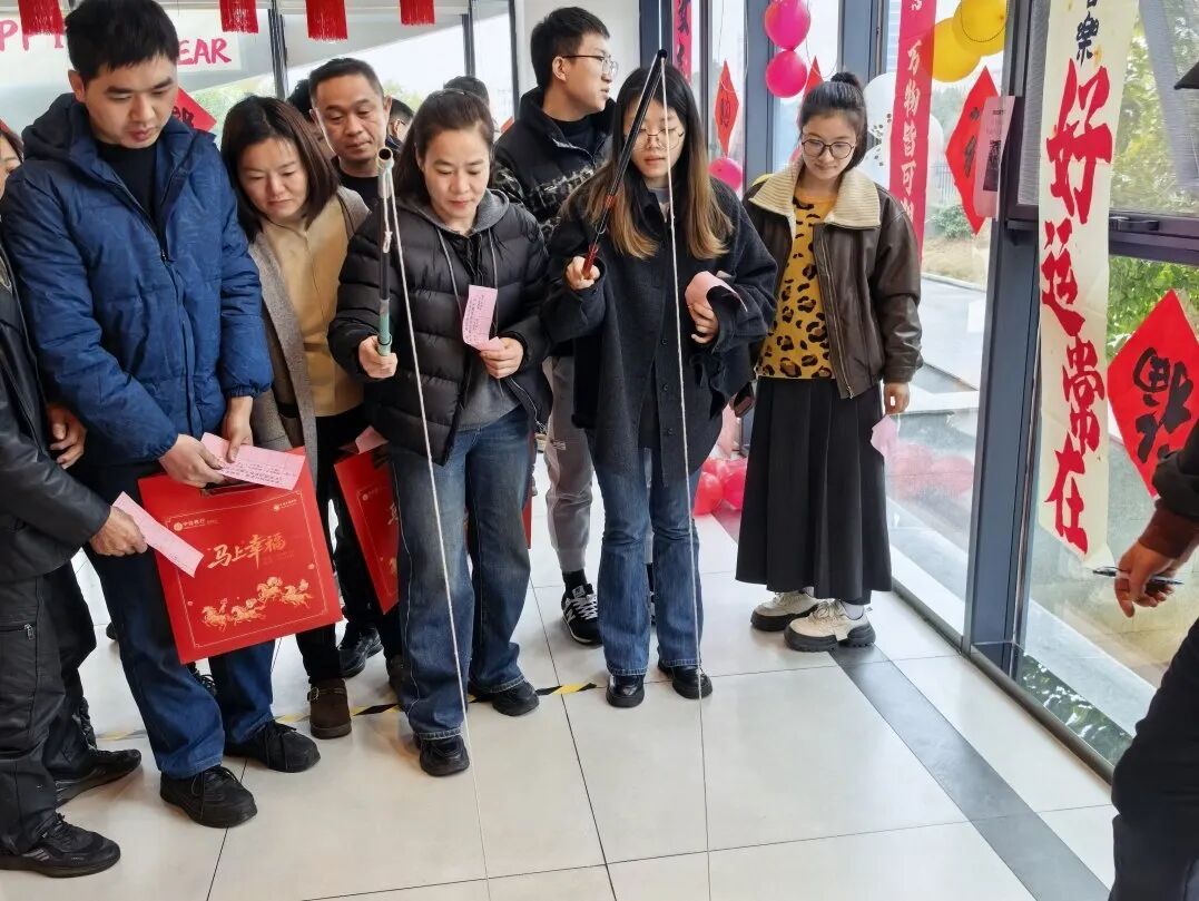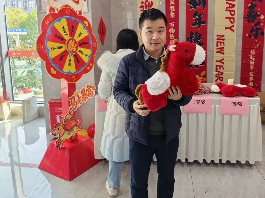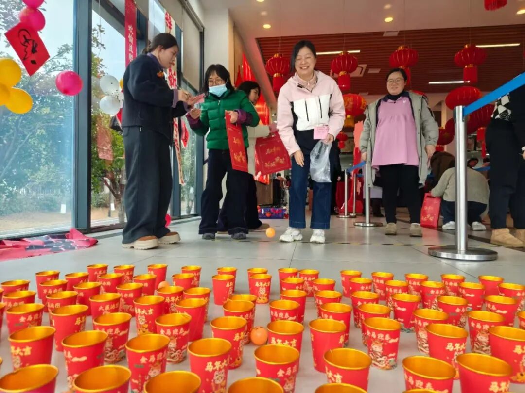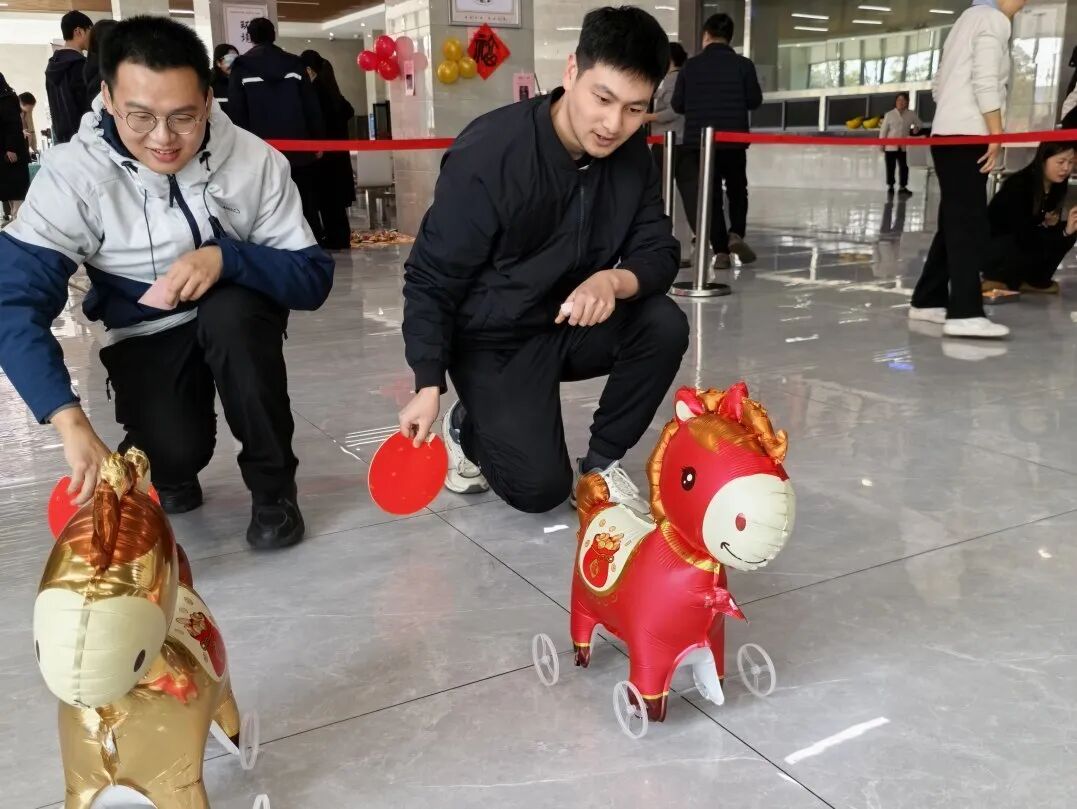 互動游戲區精彩紛呈,歡聲笑語不斷。“抓馬納福”環節中,大家手握釣鉤精準出擊,專注抓取馬年吉祥好運;“策馬奮進”賽道上,員工們凝神聚力,助力馬兒一路爭先、勇博頭彩;“鏟金納寶”場地上趣味橫生,蒙眼旋轉后精準落鏟,收獲滿滿;“幸運彩球”考驗著瞄準技巧,五“福”小球承載著期待,投中瞬間便是滿堂喝彩。